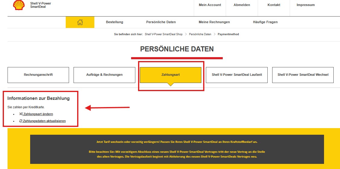 Wie kann ich meine Zahlungsart für den Shell V-Power SmartDeal im Online Konto ändern/ aktualisieren?